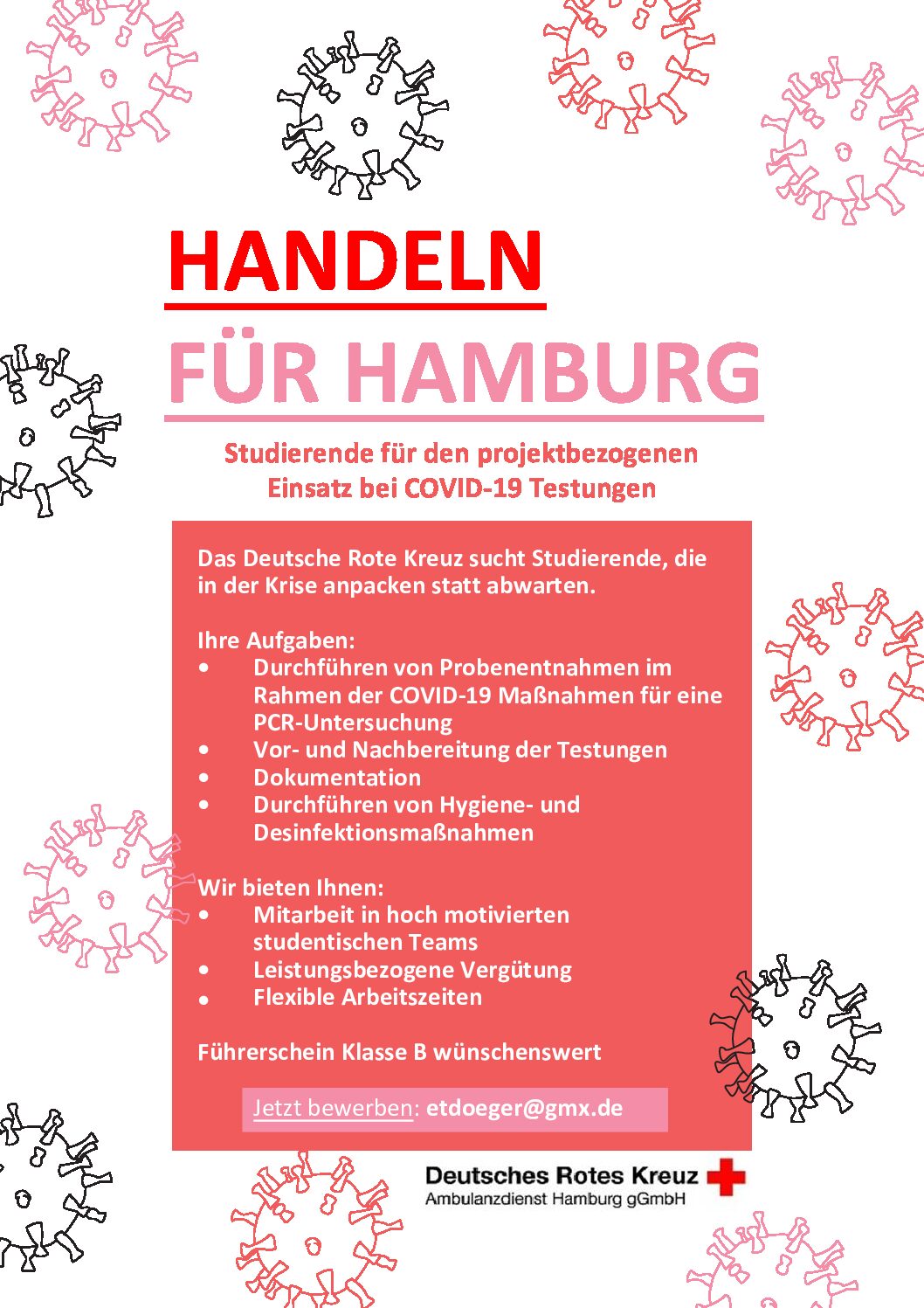 Das Deutsche Rote Kreuz sucht Studierende, diein der Krise anpacken statt abwarten. Ihre Aufgaben:• Durchführen von Probenentnahmen imRahmen der COVID-19 Maßnahmen für einePCR-Untersuchung• Vor- und Nachbereitung der Testungen• Dokumentation• Durchführen von Hygiene- undDesinfektionsmaßnahmen Wir bieten Ihnen:• Mitarbeit in hoch motiviertenstudentischen Teams• Leistungsbezogene VergütungFlexible ArbeitszeitenFührerschein Klasse B wünschenswert Jetzt bewerben: etdoeger@gmx.de